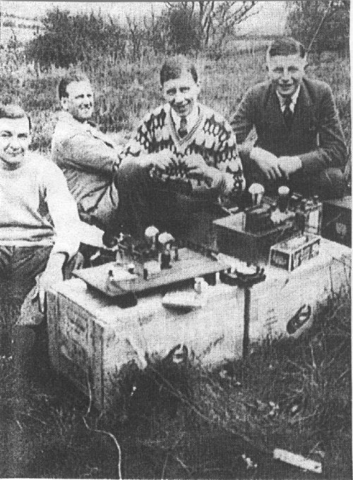 Five metre band portable operation, 1933.  Left to right: G2YD, G3MR, G2NH, G6XM.  Note the open wire feeder in the foreground with its very heavy wooden spacers.