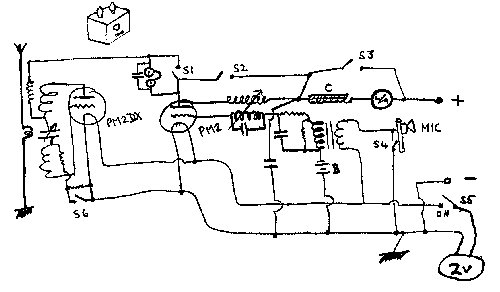 This circuit has some historic significance since it was drawn by G6NZ himself, part of his 1933 comprehensive paper “A Qualitative Investigation of the 56 Mc/s (sic) Ultra Short Wave Band”.  Only if you are very elderly might you recognise it immediately as a super-regenerative transmitter/receiver (the word ‘transceiver’ did not come into use until very much later).  The PM2DX valve has a dual purpose, it serves as a quenched detector for receiving and as a free-running Colpitts oscillator when transmitting.  The PM2 stage is clearly an audio amplifier with carbon microphone input via a transformer.  One of its functions is to amplitude-modulate the PM2DX using so-called ‘choke’ modulation, achieved by inserting the LF choke C in the high-tension supply line to both valves.  This is quite straightforward.  However the coupled inductive circuits between the grid and anode of the modulator valve show that it was also used to generate an ultra-sonic frequency to quench the detector, giving rise to the pronounced no-signal “hiss” experienced when using this type of circuit.  In super-regenerative detector / oscillator circuits the value of the resistor between grid and ground can determine whether the valve oscillates freely or is self-quenched.