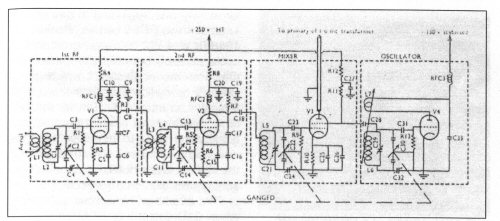 In comparing the circuit of the G5BY converter with that of the simple pre-war two-valve transceiver shown on page 28 in ‘Six News' issue 72, one begins to appreciate how equipment for the five and six metre bands had improved in the UK by 1947, no doubt aided by developments in the technology and the availability of valves and components required for war - the latter often finding their way on to the surplus market at very affordable prices. Early super-regenerative receivers were by now giving way to front-end VHF converters (one or more RF stages, mixer and tunable local oscillator) typically feeding into an HF-band receiver as the intermediate frequency amplifier. G5BY, though, used a home-brew dedicated 1.6 MHz IF strip, ahead of which he placed a variety of converters covering all the VHF bands in which he was interested (later 70 MHz and 144 MHz later claimed his attention).