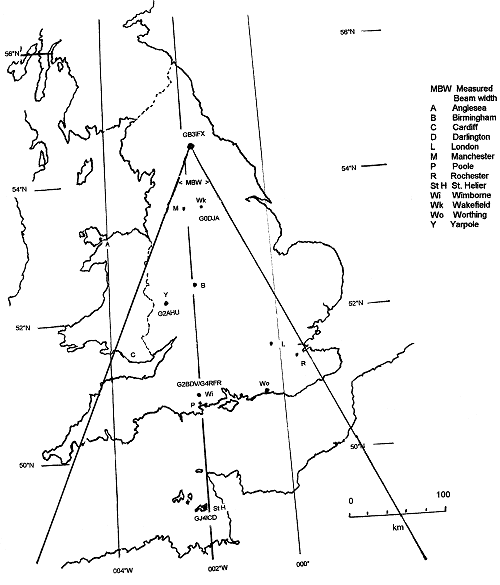 The transmitting antenna consisted of two stacked six-element yagis beaming due south from Darlington (IO94FM) giving coverage as illustrated in Fig. l. Reports were at first received from many amateur stations. Full time monitoring was conducted at Yarpole in northern Herefordshire by G2AHU, at a distance of some 264 km while tests were also conducted at a distance of 100 km by G0DJA in Wakefield, at 418 km by G2BDV and at 420 km by G4RFR, both in Wimborne.