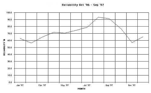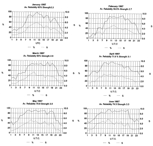 Although when considering signal strength it was thought to be of value to compare an abnormal year (1997) with figures obtained from what amounted to testing 2. 5 days per week, in the case of the reliability figures it would have been unwise to do so. Signal strengths were calculated from the strength when heard and therefore are not unduly influenced if there is a bad period between tests. But with reliability, a bad period not taken into account would make a considerable difference. Fig. 6 on page 33 shows the seasonal variation in reliability from October 1996 to September 1997, and the depressed conditions during May to July 1997.