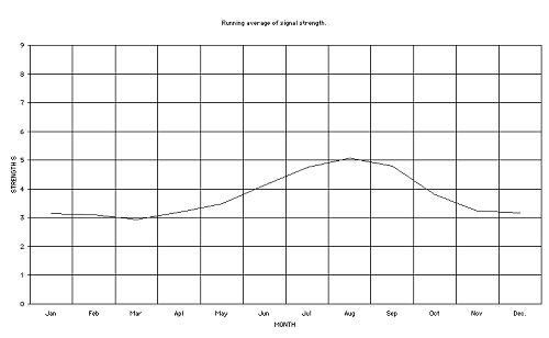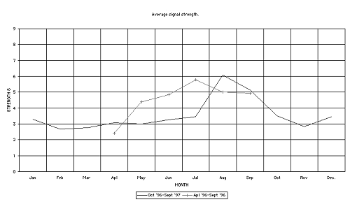 The monthly average signal strengths for all tests covering a two-year period from September 1995 to September 1997 are illustrated in figure 4 on page 32. A three-month running average has also been applied to obtain a monthly variation, from which predictions could be made. The resulting graph appears in Figure 5.