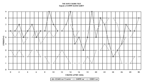 The purpose of the fading test carried out on 13th April 1997 was to examine simultaneous variations in signal strength at Yarpole and Wimborne. This was achieved by G4IFX using the same rig and antenna as GB3IFX but with a linear amplifier supplying 400 watts input to the antenna.