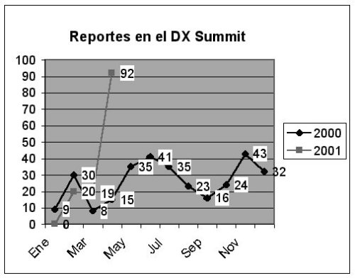 From the following graph one can appreciate that during the period under study the majority of DX reports occurred during the months of June, July, August and November. Nevertheless it was this April when the number of mentions was extraordinarily high: 92, when, as the graph in Figure 2 shows, in a good month the average would be about 30 mentions.