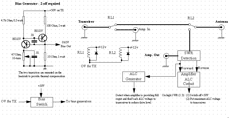 Figure 11 shows the ancilliary circuits for the amplifier. The two bias circuits are driven from a switched +50V supply. The four transistors are bolted to the heatsink as shown in Figure 6. The other components of the bias circuit are mounted on the PCB above, and beside, the transistors. The two 5-watt 100 Ohm resistors are placed against the side wall of the heatsink and held in place with an aluminium bracket. All of the amplifier ancilliary circuitry is be built into a separate cabinet which is connected to the amplifier by a short umbilical cable.