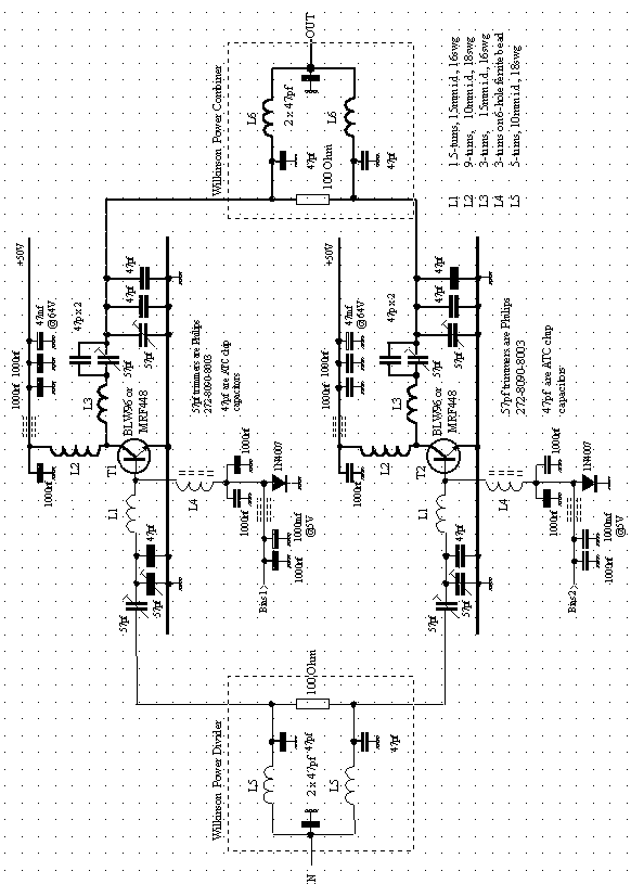 It is recommended that each amplifier is initially tuned individually by disconnecting each in turn from the Wilkinson splitter and combiner and connecting to a 50 Ohm dummy load. Once each amplifier is working correctly, they should be reconnected to the input/output circuitry and final adjustments made. Be very careful at this stage and or) not detune too much. Just move the trimming capacitor a little bit at a time to achieve the required matching. It is all too easy to seriously detune an output circuit which could cause an explosion. Once aligned, and used with a suitable ALC circuit to prevent overload, the amplifier should provide excellent service with IMD performance at as good, or better, than a valve based design. It is interesting to note that I have never seen a need to use phased switching of the power supplies and changeover relays to prevent hot switching.