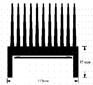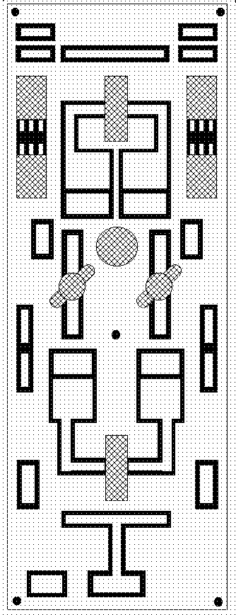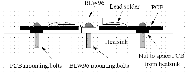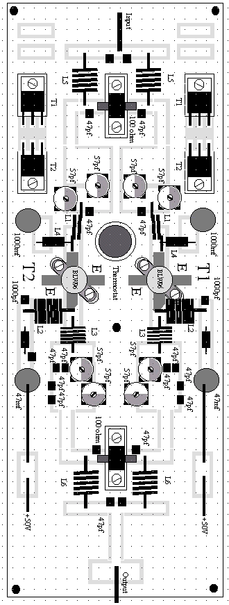 As shown in Figure 3, the two amplifiers use quite conventional low-pass L-matching circuits to match to the 50 Ohm inputs and outputs of the Wilkinson power splitter/combiner. 'the design of these circuits is beyond the scope of this article has been covered elsewhere. What I would like to concentrate on is physical design issues that need to be taken into consideration when building an amplifier of this power. Figure 4 shows the PCB layout at half full size. To reproduce, just pass it through a photocopier on x2 Figure 4 -PCB at 1/2 Full Size magnification. The length of the board should be 27 cm. The PCB uses standard double-sided copperclad board. The cross-hatched areas are cut out holes in the PCB to allow the BLW96s, bias transistors, thermostat, and the power splitter resistors to be bolted to the underlying heatsink. The black areas are not etched but cut out using a sharp knife. and a steel ruler. These gaps provide isolation between the pads and the ground plane Bearing in mind the high voltages in the output circuitry especially, make sure they are not less than 2mm wide. A flashover... well I do not need this further! The PCB is mounted on the heatsink as shown in Figure 5. The BLW96 is bolted to the heatsink using 6BA screws and heatsink compound. In this design especially make sure that the transistors are firmly bolted to the heatsink, and that there are no chamfers on the bolt holes. Going from zero to I kilowatt in less than a microsecond presents a rather high thermal and physical stress to the devices!