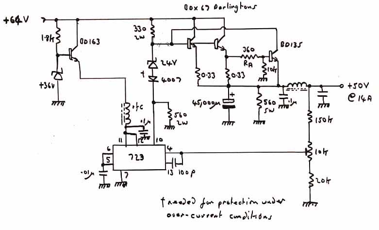Although not part of the original article I published in RadCom a possible high power regulator circuit that would form the heart of a 20amp +50V power supply. My original drawing of the circuit is below.