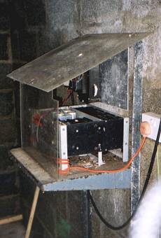 The beacon itself mounted on a wall next to six foot high water tank. The beacon power supply was covered in shrew's droppings to a depth of 1.5 cms. It took me about half an hour to clean up the beacon itself which was also in a sorry state. It is located next to a large tank of water and there were many holes for rodents to come in and out of the building when there is bad weather. |