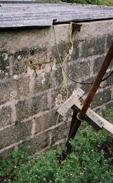 The beacon antenna mast showing how the bolts holding the top bracket to the wall have rusted through. |