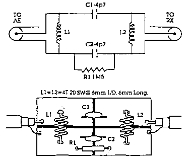 At UHF the conditions are reversed. Cl and C2 presenting a low impedance path to signals to the receiver, and the impedance of L1 and L2 is so high as to be ignored. R1 is for static discharge of the outer screen.