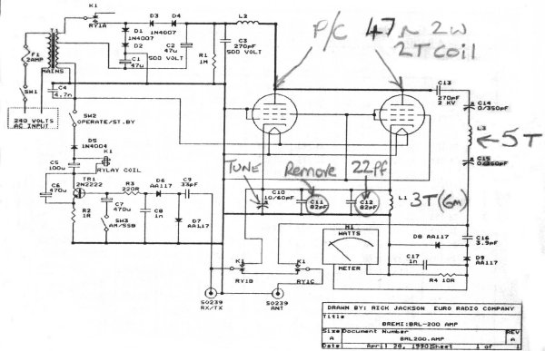 The circuit for the BREMI BRL-200, with MØBCG's modifications marked.