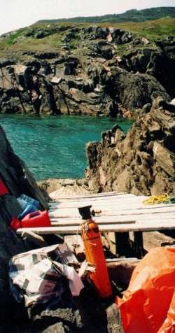 We travelled over by a long-liner boat , the Heidi M skippered by Mr Robert Courtney. Roberts knowledge of the seas, weather and rocks proved to be worthwhile as we waited for our opportunity to sail. A day late, we missed one storm and although we landed in another, we later found out that if we had waited yet another day things would have been a lot worse. This writer had trouble keeping his breakfast down, but then I didnt have the experience that Doug and Dennis had when it came to riding 20-25' waves out on the open water. I thank them for not laughing at me, as I looked closely at the inside of a giant rubber pail!