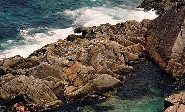 All the gear (two carloads and one truckload, well over a ton) had to be hoisted 8-10 into the air, up onto part of an old ramp that was a piece of a wharf that had long ago broken up and had been washed to sea. It had every other board missing and was quite slippery when covered with wet sea water in the salty air. Balancing yourself on that, while carrying 100lbs of gear in a 65 gallon tub proved to be tricky, but not impossible. The next leg of the journey was across 100 or so feet of sharp jagged rocks, uphill, with the odd puddle of standing water or where fresh rainwater had been collecting that day.