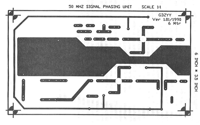 Components are mounted through the copper ground plane. The screens that run down the centre of both sides of the PCB, are constructed from the same material about one inch high and are soldered to the earth plane. The earth plane on both sides should be pin soldered together at the points shown. The container should be RF tight, e.g. a die-cast box.