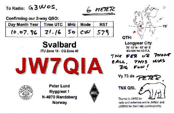 I spoke with Ole, JW8GV, on the landline today (14th July). He says that he is the 'real' 6m metre guy in JW but he was unsure of his cw capability so he let Peter, JW7QIA operate the station following my call. To operate they have to disconnect the beacon antenna and change it over to a transceiver owned by Ole. Ole is in JW for another twelve months but is leaving to go back to Norway for a holiday between July 25th and August 27th 1996. Ole was really surprised at the strength of the signals (s9+) on 6m and is planning to put up another antenna separate to the beacon. It seems Matt, JW5NM, is less interested in 6m.
