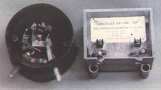 For the first few years of operation on 6m I seemed to spend all of my time answering knocks on the door (I still have them in 1996!) from concerned neighbours suffering from TVI. As I said in the article, the simple task of filtering never seemed to work for me. The reason for this is exemplified in the photograph found below. Most of the houses around are old and it seemed that most of the TV antennas were installed in the 1960s or 1970s. After a few trips up to local roof tops the reason became all too apparent. As can be seen below, many of the masthead amplifiers seemed to be first generation' devices. The one shown on the left was particularly bad in this respect as it consisted of one transistor, two resistors, a coil, and two capacitors only! The model on the right is exactly the same but is better packaged. Indeed, this German model is rated, as stated on the label, at 18dB gain at VHF and 22db gain at UHF!