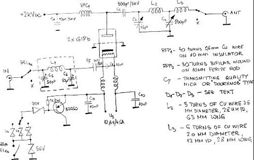 C8, C9 and C10 are standard ceramic capacitors, 400V DC. RFC2 is bifilar wound on a 10 mm diameter ferrite rod 10 cm long.